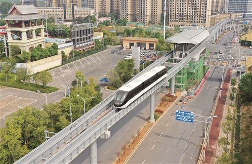 9月26日,湖南湘江新区大王山片区,一列云巴列车在轨道上试运行。该项目作为大王山度假区内旅游观光的主要线路,是大王山景区与外部交通枢纽联系的重要通道,全长约8.11公里,设站9座,设计最高时速80公里,串联欢乐雪域、欢乐天街、湘江女神公园、桐溪湖、华谊兄弟(长沙)电影小镇、欢乐海洋等景点,力争今年底实现载客运营。 湖南日报全媒体记者 田超 摄
