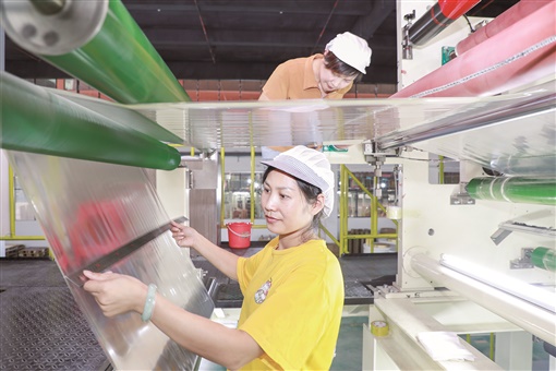 9月27日,新田县德润新材料产业园,工人在赶制新材料产品。今年,该县通过结对帮扶,在稳企用工、退税减税、金融信贷等方面帮助企业解难纾困,园区企业实现了产销两旺的良好态势。