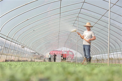 9月29日,澧县官垸镇常发村,村民在油菜大棚育苗点洒水抗旱。当天,该镇调度镇消防站消防车送水到油菜育苗点,助力油菜抗旱育苗,保障秋播顺利进行。柏依朴 傅明杰 摄影报道