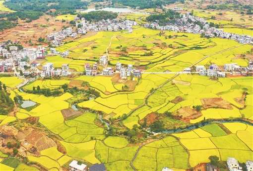 上图:10月8日,嘉禾县普满乡寿竹洞片区,成片稻田满目金黄,呈现一派美不胜收的丰收景象。黄春涛 摄
