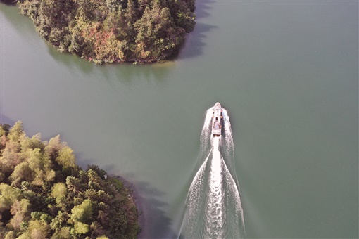 初秋时节,从芷江蟒塘溪水电站出发,乘船驶向㵲水河深处,秋日暖阳照射在碧波荡漾的湖面上,一路风景撩人心弦。只见成群的野鸭子在水上欢快地觅食,昔日渔舟穿梭、撒网捕鱼的繁忙景象已不见踪迹……一种“绿水逶迤去,青山相对开”的意境油然而生。
