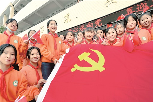 10月13日是中国少年先锋队建队73周年纪念日,溆浦县北斗溪镇学校的学生们簇拥着党旗合影。当天,该校开展“童心永向党 ,喜迎二十大”主题教育,引导少年儿童铭记党的光辉历程,厚植爱党爱国情怀。曾雅君 阳金桂 摄影报道