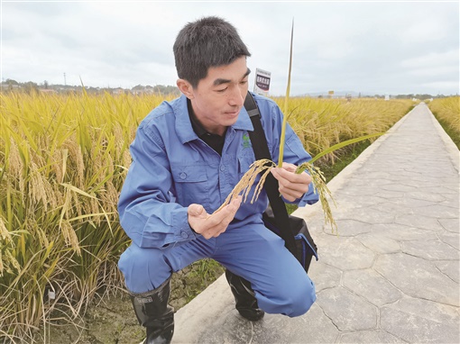 “津两优1122”稻穗低垂、谷粒饱满。陶优生站在田埂上,看穗长、计粒数,结实率达80%以上,明显高于对照品种,在南方缺水地区作中稻栽培前景广阔。