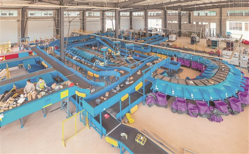 10月13日,蓝山县创品国际智慧物流园,智能分拣系统在对快件包裹进行有序分拣。近日,该县物流园智能快递分拣中心正式投入运营,通过整合全县多家物流资源、运用机器智能化分拣、优化村镇物流配送路径等措施,有效降低物流企业生产成本,提升县、乡、村三级快递物流配送效率。 彭华 摄