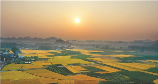 10月26日,江永县潇浦镇石角村,稻田在朝霞的映衬下显得格外美丽,与远山、村庄等构成一幅壮美的丰收画卷。黄海 摄