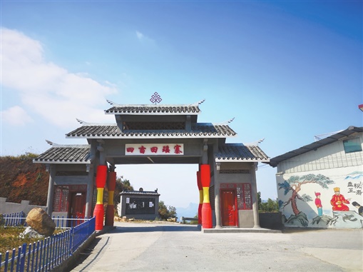出景区后几里路,就进入我们采风的四亩田瑶寨。驻村的乡村振兴帮扶工作队负责人在瑶寨山门前迎候我们,他向我们介绍:山门为三间三层坡顶建筑,总长12米12根柱,寓意瑶族十二姓。撑立中间的四根柱形似长鼓,顶部是梧桐树图腾,圈花为瑶族龙犬图腾。走进瑶寨,瑶族历史气息扑面而来:迁徙千家峒、漂洋过海、盘王祝寿、还盘王愿等长方形壁画,是用仿古的金黄色料特制而成,图案金光熠熠;瑶家民风民俗的大幅壁画映入眼帘,大美瑶寨、男耕女织、长桌宴、长鼓舞、竹竿舞、春夏秋冬场景的巨幅画分外醒目。约几亩水面山塘旁的“天福长廊”,长48米,宽3.2米,为砼仿木廊结构,是瑶寨乡民议事,摆长桌宴、红白喜事宴宾客场所。