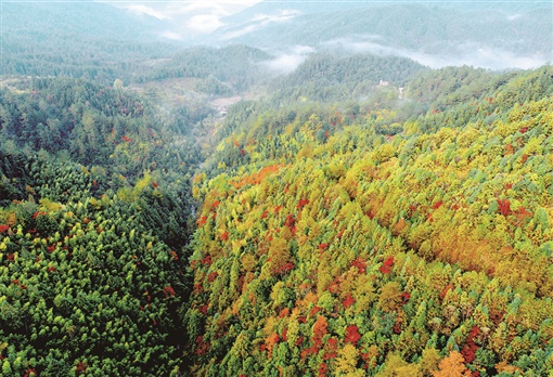11月24日,小雨后的桂东县东洛乡齐云山村,广阔林海仿佛被泼上了彩墨,薄雾轻飘,民居点缀,呈现出一幅美丽的生态画卷。