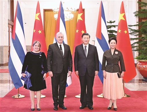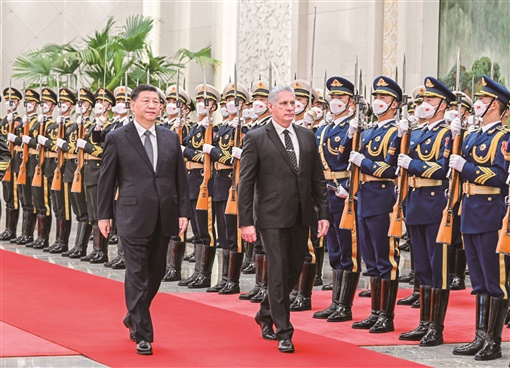 习近平指出,你是中共二十大后首位访华的拉美和加勒比国家元首,充分体现了中古两党两国的特殊友好关系。古巴是西半球第一个同新中国建立外交关系的国家,中古关系成为社会主义国家团结合作、发展中国家真诚互助的典范。中方愿同古方不断深化政治互信,拓展务实合作,在涉及彼此核心利益问题上坚定相互支持,在国际和地区事务中加强协调配合,在建设本国特色社会主义道路上携手并进,不断深化新时代中古关系。