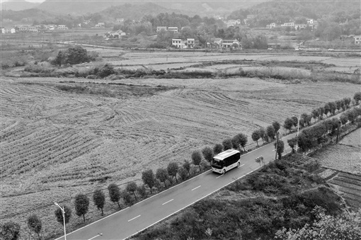 11月30日,公交车行驶在长沙市岳麓区雨敞坪镇的乡间公路上。当天,长沙市共开通9条“村村通”公交线路,全面实现主城区城乡村村通公交车。