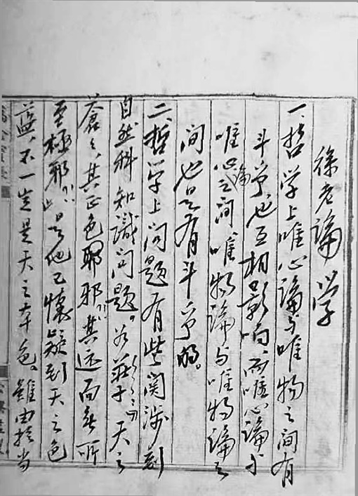 《记徐老来访》是另纸写的,《徐老论学》则是写在线装函册里。时间大约在1957年。那时徐老住在京城西单堂子胡同20号一所独院,是二层小楼,与我家四合院(西黄城根南街)相距不远,步行一二十分钟可到。徐老是中央委员、中宣部副部长,尽管中宣部给他配有专车,但他总是步行来我家,伴有一位警卫员。每次他来家都与父亲吕振羽纵谈历史与哲学,从古到今,其乐融融。逢母亲在时则作记录。我也多次见过这位满头白发、衣着朴素、和蔼可亲的老前辈。尤其是得知他过去是毛主席的老师,更让人肃然起敬。