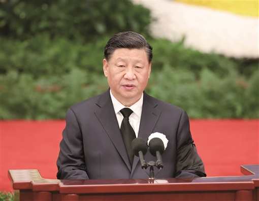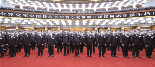 在全场凝重的气氛中,习近平致悼词。习近平在悼词中高度评价了江泽民同志光辉的一生和建立的丰功伟绩。他指出,从党的十三届四中全会到党的十六大的13年中,国际形势风云变幻,我国改革开放和社会主义现代化建设进程波澜壮阔。在国际国内十分复杂的形势下,江泽民同志带领党的中央领导集体,高举马克思列宁主义、毛泽东思想、邓小平理论伟大旗帜,坚持党的基本路线不动摇,紧紧依靠全党全军全国各族人民,坚定不移坚持和发展中国特色社会主义。江泽民同志深刻洞察世界新军事变革的发展趋势,主持制定了新时期军事战略方针,强调要推进中国特色军事变革,坚定不移走中国特色的精兵之路,加强人民军队革命化、现代化、正规化建设。在江泽民同志亲自领导和大力推动下,我国国防和军队现代化建设取得了巨大成就。江泽民同志集中全党智慧创立了“三个代表”重要思想,进一步回答了什么是社会主义、怎样建设社会主义的问题,创造性回答了建设什么样的党、怎样建设党的问题,深化了我们对新的时代条件下推进中国特色社会主义事业、加强党的建设的规律的认识,以新的思想、观点、论断,继承、丰富、发展了马克思列宁主义、毛泽东思想、邓小平理论。