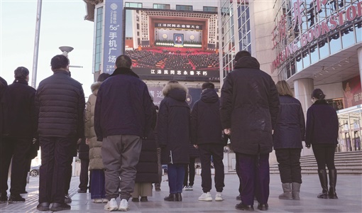 12月6日上午,中共中央、全国人大常委会、国务院、全国政协、中央军委在北京人民大会堂隆重举行江泽民同志追悼大会。举国上下,各族人民沉痛悼念江泽民同志。这是在北京王府井大街,群众肃立默哀。(本版照片均为新华社发) |