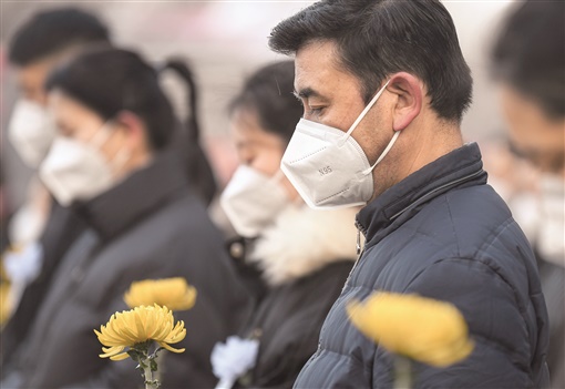 这是在山东省青岛市,干部职工肃立默哀。 |