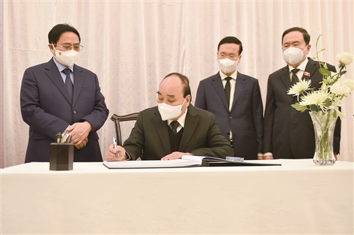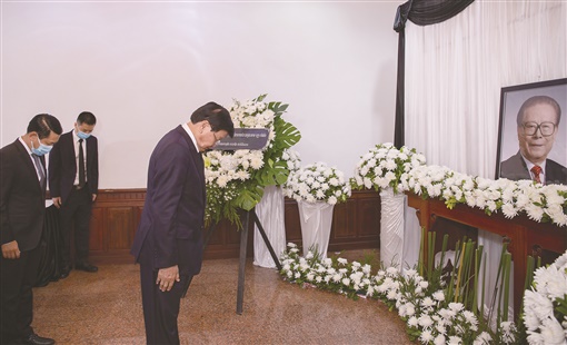 12月2日,越南国家主席阮春福(左二)、总理范明政(左一)等在中国驻越南大使馆吊唁江泽民同志。 |