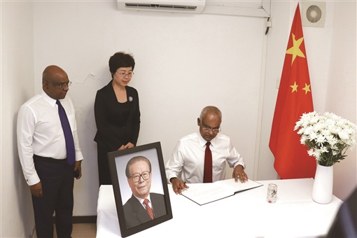 12月5日,马尔代夫总统萨利赫(右)在中国驻马尔代夫大使馆吊唁江泽民同志。 |