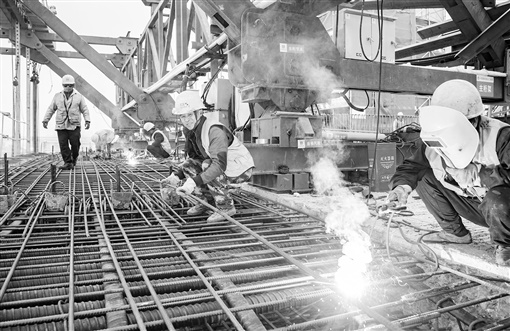 12月6日,长沙市金桂路跨浏阳河大桥项目建设工地,中建五局施工人员在凛冽寒风中作业。项目建成后,将极大改善市区东部的交通路网。