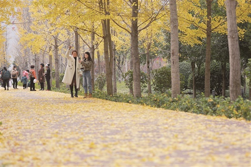 12月11日,游人在金黄的银杏林中赏杏休闲。近日,吉首市乾州街道世纪大道旁的银杏林一片金黄,吸引了众多游人前来欣赏。 彭彪 摄