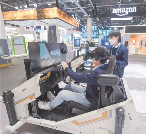 图为12月11日,在首届全球数字贸易博览会现场,工作人员在展示虚拟驾驶系统。