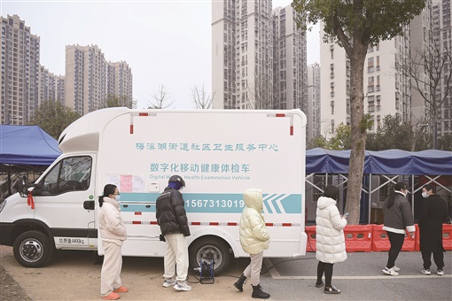 12月20日,湖南湘江新区梅溪湖街道社区卫生服务中心配备的数字化移动健康体检车,可以对疑似病人进行筛查。18日以来,该社区卫生服务中心紧急采购市民急需的退烧药,为每位有需求的发热居民赠送6粒,确保居民“病有医、不断药”。