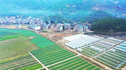 12月20日,新田县中山街道东升村,绿意盎然的菜地和蔬菜大棚与错落有致的乡村民居相互映衬,构成了一幅美丽乡村画卷。