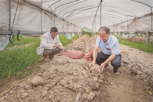 2020年7月28日,王先有(右)和助手在试验大棚里研究袋料茯苓栽培技术。 辜兴平 摄