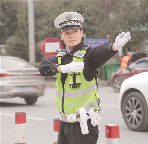 12月19日下午,邵阳县塘渡口镇第五完全小学前面的振羽大道,车辆川流不息。县公安局交警大队辅警邓苞苞引导一批又一批放学的小学生过马路。
