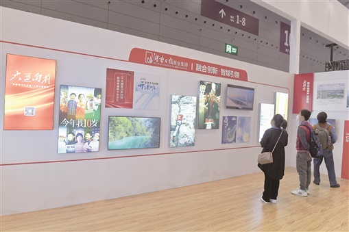 湖南日报报业集团展区以“智媒引领、数字赋能”为主题,重点展出了《大道向前》《今年我10岁》等主流作品、《大湖之蓝》等爆款融媒产品矩阵、《湖湘一万年》《简牍里的中国》等2023年重点项目,展现了加速打造全国一流省级党报集团的奋进姿态。现场,不少观众拿出手机扫码观看了解这些融媒体精品力作。湖南日报社始终坚持守正创新、内容为王,从“国之大者”中找方向、从省之大计中找坐标、从民之大业中找落点,不断推出有思想、有温度、有品质的精品。