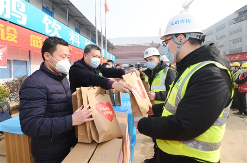 1月6日,长沙市开福区东鹏饮料长沙基地项目建设工地,一线建设者开心地领取防疫健康包。当天,开福区“开福建设,感恩有您——向农民工朋友赠送健康服务活动”在区内4个项目工地同时进行,为一线建设者赠送了防疫健康包和健康体检服务。
