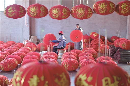 1月7日,双峰高新区湖南吉瑞风宫灯科技发展有限公司,工人在制作灯笼。春节临近,灯笼销售迎来黄金季,该县各灯笼生产企业加班加点赶制红灯笼,供应节日市场。李建新 摄