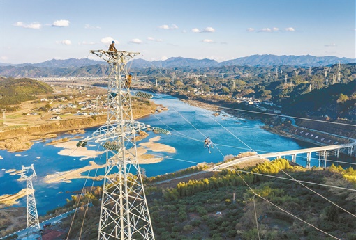 1月13日,国网怀化供电公司组织施工人员加紧110千伏黔托线π接输电工程建设,确保洪江市110千伏清江湖变电站按期竣工投运,为提高怀化市西部电网供电能力和供电可靠性提供保障。胡浩 摄