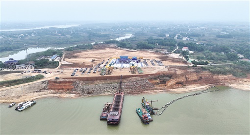 走进虞公港建设工地,看不到一丝冬日的残败,跃然眼前的,是火热的施工现场,一旁,湘江水光潋滟,奔流北上。极目远眺,烟霞缥缈,天地一色。