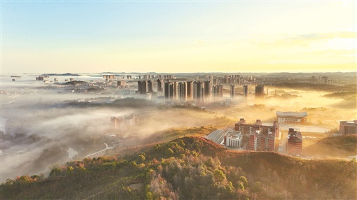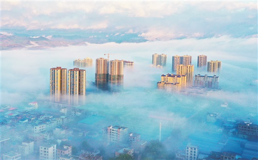 1月13日清晨,湘南多地出现平流雾景观,薄雾缓缓流动,城市建筑若隐若现,美不胜收。上图为常宁市,右图为新田县。