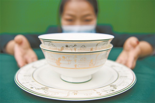 1月13日,湖南博物院,工作人员展示“君幸食”文创瓷器。该文创瓷器由湖南博物院与湘菜品牌费大厨辣椒炒肉联合推出,设计灵感来源于现代云纹以及马王堆汉墓“君幸食狸猫漆食盘”。瓷器主要工艺为釉下彩,釉面光滑饱满,风格大气典雅。湖南日报全媒体记者 辜鹏博 摄