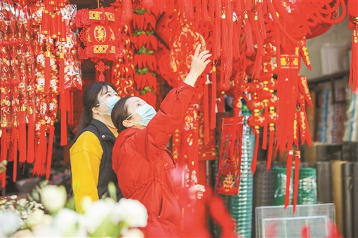 1月13日,蓝山县一家年货市场,市民在选购饰品。春节临近,该县各年货市场热热闹闹,人们忙着选购年货迎佳节。彭华 摄
