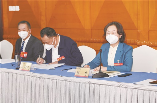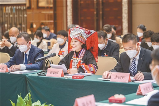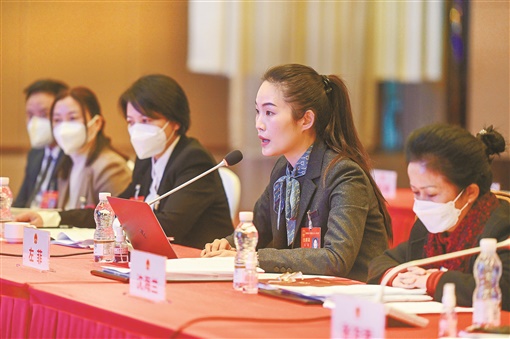 1月14日下午,常德市代表团左菲代表(右二)就职业教育培养人才、服务社会经济发展发言。湖南日报全媒体记者 郭立亮 摄 |