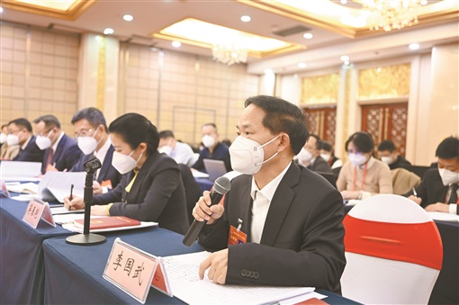 1月14日,岳阳市代表团李国武代表(前排右一)就恢复和扩大消费建言。湖南日报全媒体记者 辜鹏博 摄 |