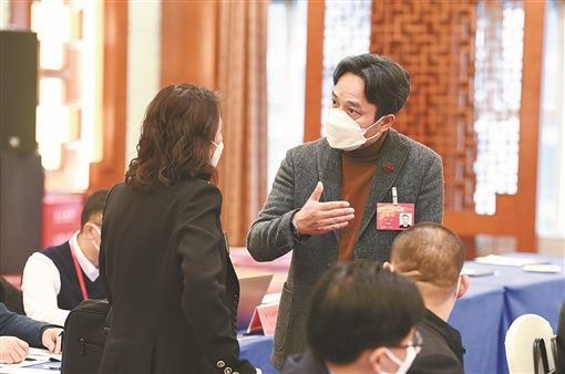 1月14日下午,省政协小组讨论会间隙,汪涵委员(右一)与其他委员进行交流讨论。湖南日报全媒体记者 徐行 摄 |