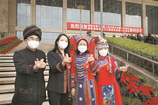 1月13日,省政协委员胡文峰、李红、黄琴和蓝利丽(从左至右)身着民族服饰做“比爱心”手势,满怀信心出席盛会。湖南日报全媒体记者 罗新国 摄 |