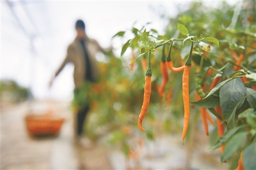 1月12日,衡东县三樟镇,椒农在大棚采摘黄贡椒,供应春节市场。近年,衡东县通过推广黄贡椒秋延过冬、错季分批种植技术,建设智能温控大棚,引进自动播种机等方式,推动黄贡椒成为促进农业增效、农民增收的支柱产业。肖亚辉 摄