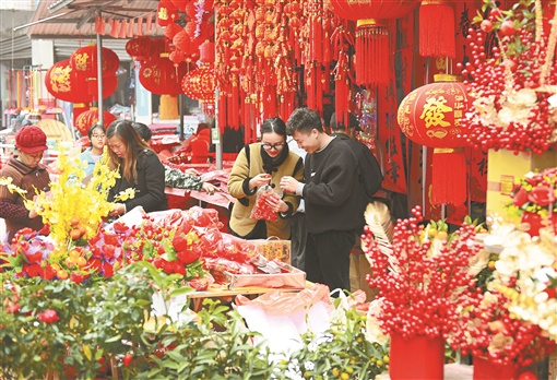上图:1月13日,武冈市水西门街道一家贸易市场,顾客在选购喜庆饰品。春节临近,该市年货市场供应充足,采购年货的市民络绎不绝,购销两旺。