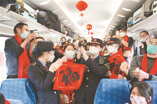 福州火车站与四川省人民政府驻厦门办事处联合开展“畅通春运返乡路”活动。1月13日,260多名在闽川籍务工人员及家属提着大包小包的行李,从出租屋、工厂等地赶到福州火车站,免费乘坐K1268次列车踏上返乡之旅。图为当日,K1268次列车的乘客和乘务员在车厢里唱歌。