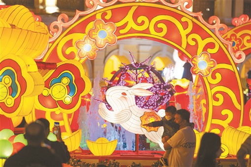 春节将临,澳门市政署以“吉祥金兔贺新禧”为主题于澳门各区布置贺年灯饰,营造浓厚的节日氛围。图为1月14日,市民在澳门议事亭前地观赏春节灯饰。