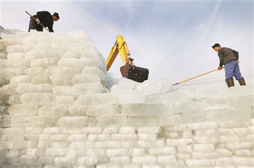 时值三九,河北省唐山市丰南区黑沿子渔港附近的农民忙着切割冰封的河面获取冰块并储存,用于水产、蔬菜保鲜等行业。图为1月14日,丰南区黑沿子镇的农民在整理码放采集的冰块。