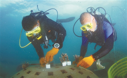 在海南省三亚市亚龙湾相关海域,珊瑚礁生态修复项目近期完成修复工作。该项目采用投放人工生态礁及移植珊瑚种苗的方式完成生态修复,预期珊瑚种苗半年存活率80%以上、一年存活率达70%以上。图为该海域,潜水员在向人工生态珊瑚礁礁体上移植珊瑚(2022年11月16日摄)。本版图片均为新华社发