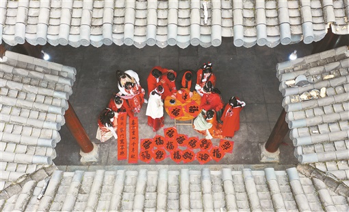 1月14日,新田县骥村镇骥村社区文明书院,书法爱好者为群众写春联和“福”字。当天,新田县书法家协会举行传统习俗迎新春活动,通过挂灯笼、写春联、送“福”字等方式,为当地群众送上新春的祝福。刘贵雄 陈祉凝 摄影报道