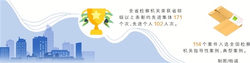 荣获省部级以上表彰的先进集体171个次、先进个人102人次;省检察院被党中央、国务院授予“全国脱贫攻坚先进集体”,获评“第二届中国生态文明奖”先进集体、“全国扫黑除恶专项斗争先进单位”等荣誉;114个案件入选全国检察机关指导性案例、典型案例……