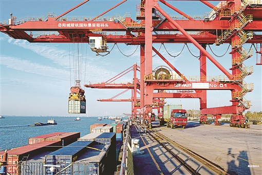 2019年10月19日,岳阳城陵矶国际集装箱码头,一艘艘江海轮整齐排列在岸边进行装卸作业。(资料图片)湖南日报全媒体记者 徐典波 摄