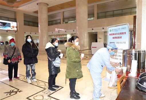 提供便民健康服务,医院免费发放新冠肺炎大众预防方“大锅汤”,该中医药预防方剂具有提高免疫力,增强体质的作用。患者李女士喝到了第一杯免费发放的中药“大锅汤”后,她高兴地说:“药的味道有些甘甜,感谢医院提供这一便民健康服务,让我感到暖身又暖心……”