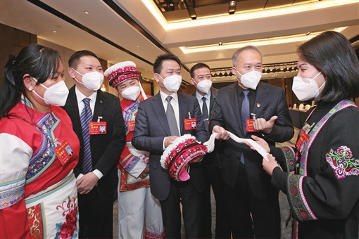 1月16日下午,怀化市代表团钟芳、唐周、舒艳鹏、李中平、杨骐铭、杨尚真和姚嘉慧代表(从左至右)就弘扬民族传统技艺,让民族饰品在乡村振兴中发挥更大作用展开交流。 湖南日报全媒体记者 罗新国 摄 |
