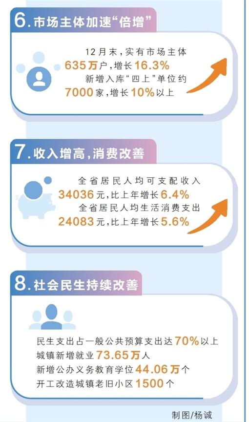 2022年,全省固定资产投资增长6.6%,进出口贸易总值突破7000亿元关口,粮食产量连续3年保持在600亿斤以上,城镇新增就业73.65万人,居民人均可支配收入比上年增长6.4%……